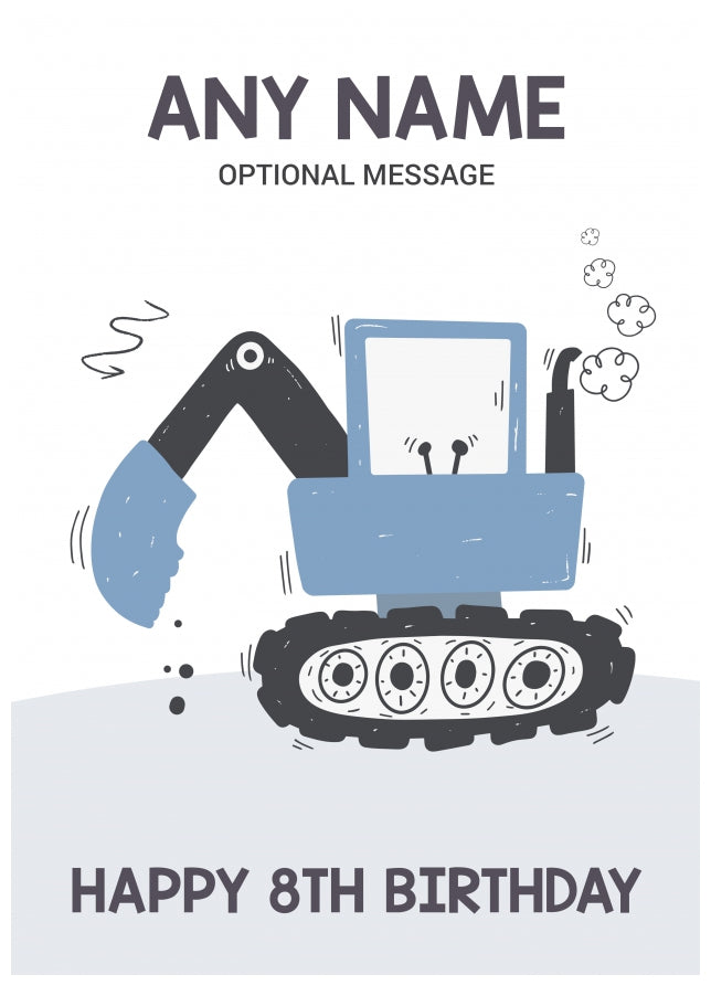 This fun 8th birthday card for Any Name shows blue digger and has the following text.
