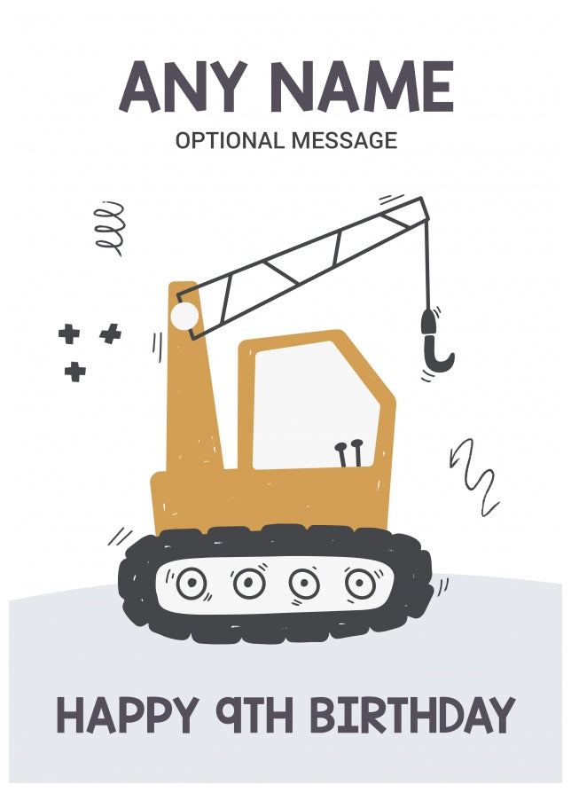 This fun 9th birthday card for Any Name shows yellow crane and has the following text.