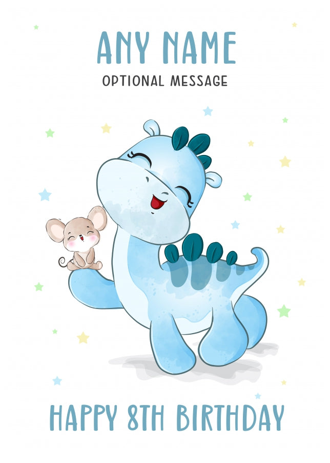 This fun 8th birthday card for Any Name shows a cute dinosaur and a mouse. With the following text.