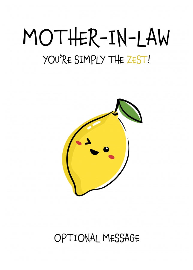 This cute Birthday card for Mother-in-law has been designed with a cute lemon on the front and the following wording: