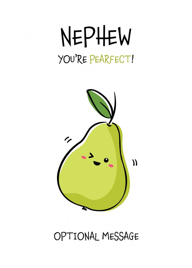 This cute Birthday card for Nephew has been designed with a cute pear on the front and the following wording: