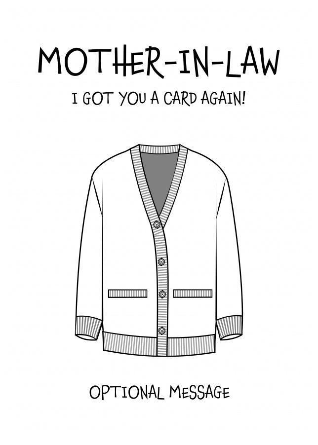 This cute Birthday card for Mother-in-law has been designed with a minimal picture of a cardigan on the front and the following wording: