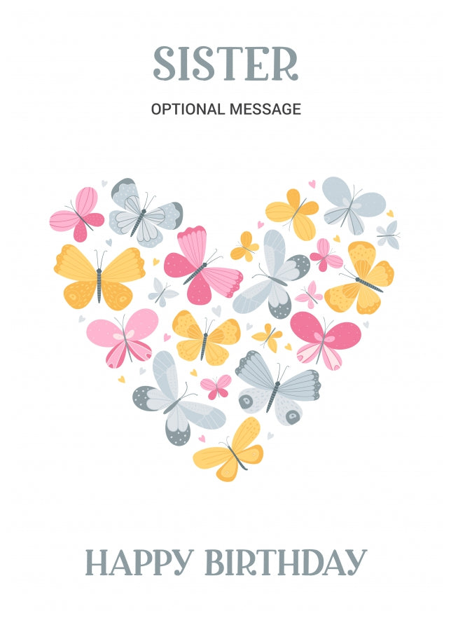 This cute butterfly birthday card for her has been designed with colourful butterflies in the shape of a heart and shows the following text: