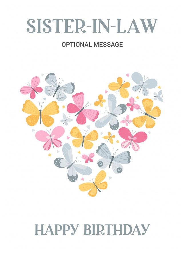 This cute butterfly birthday card for her has been designed with colourful butterflies in the shape of a heart and shows the following text: