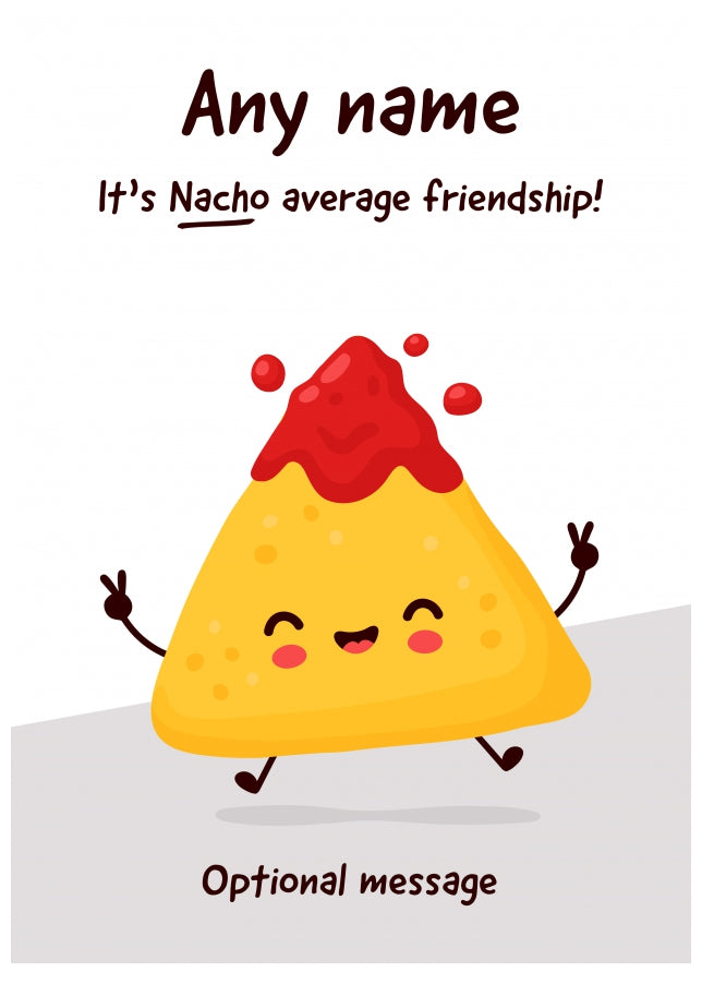 This friendship thank you card has been designed to stand out with a funny nacho on the front. A single thank you greetings card that shows the following text:
