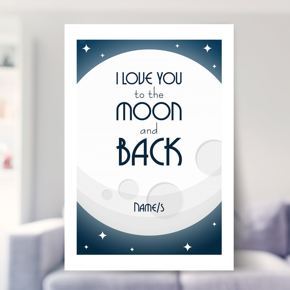 A very special message for someone you love. This stunning personalised print shows the moon surrounded by stars with the above quote on. Can be made unique and personalised with couples names or an individuals name on the bottom. This would make an ideal gift for weddings, anniversaries, engagements, Valentines Day and even as a personalised Christmas gift.