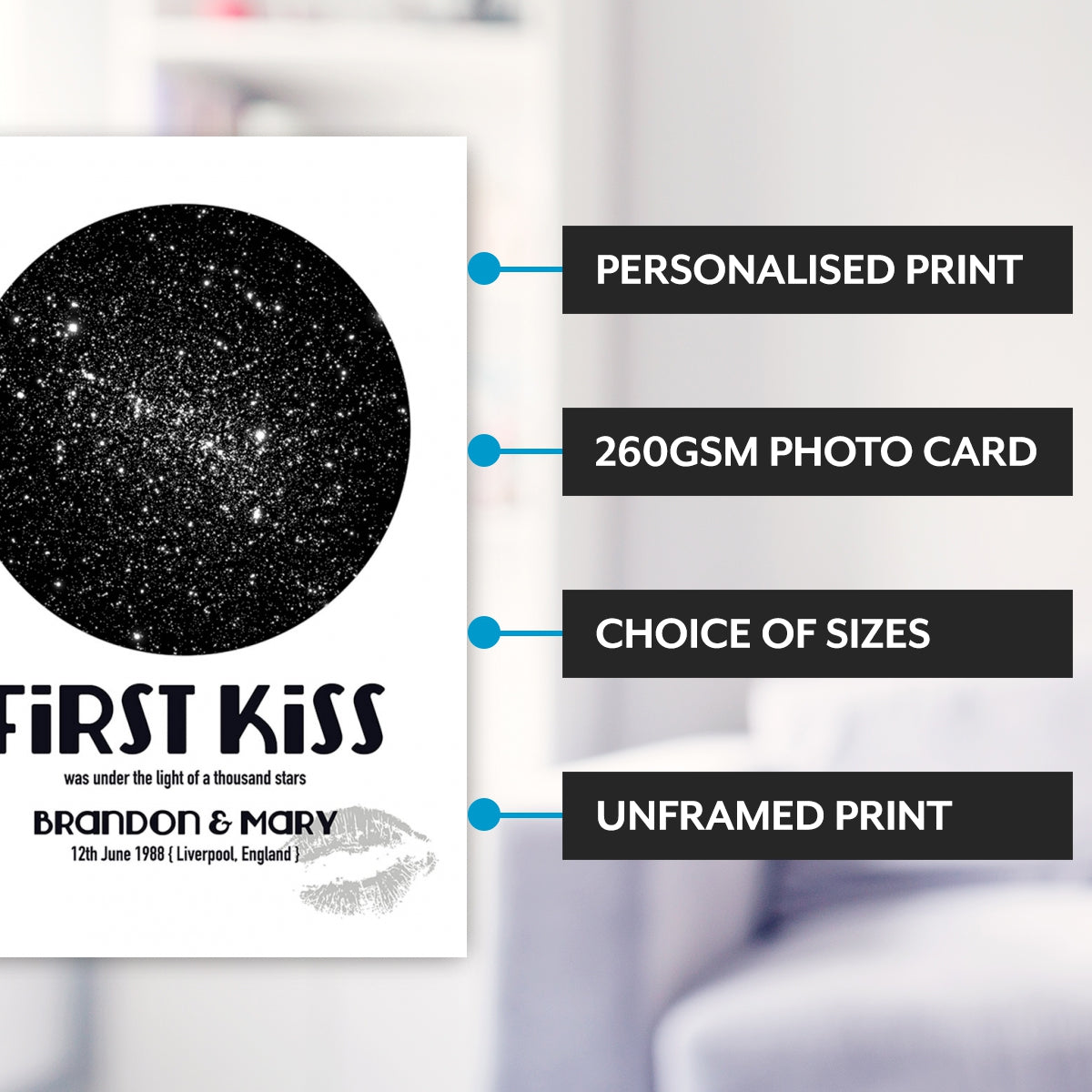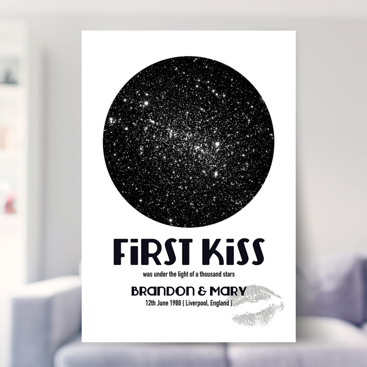 It's simple, just tell us the date, time and location and we will capture the night sky at that moment. On this print you will see white stars. With our specialist and professional astronomy software we will pinpoint the night sky at that specific moment! All names and text can be changed on the print to anything you want to make it out of this world personal for you.