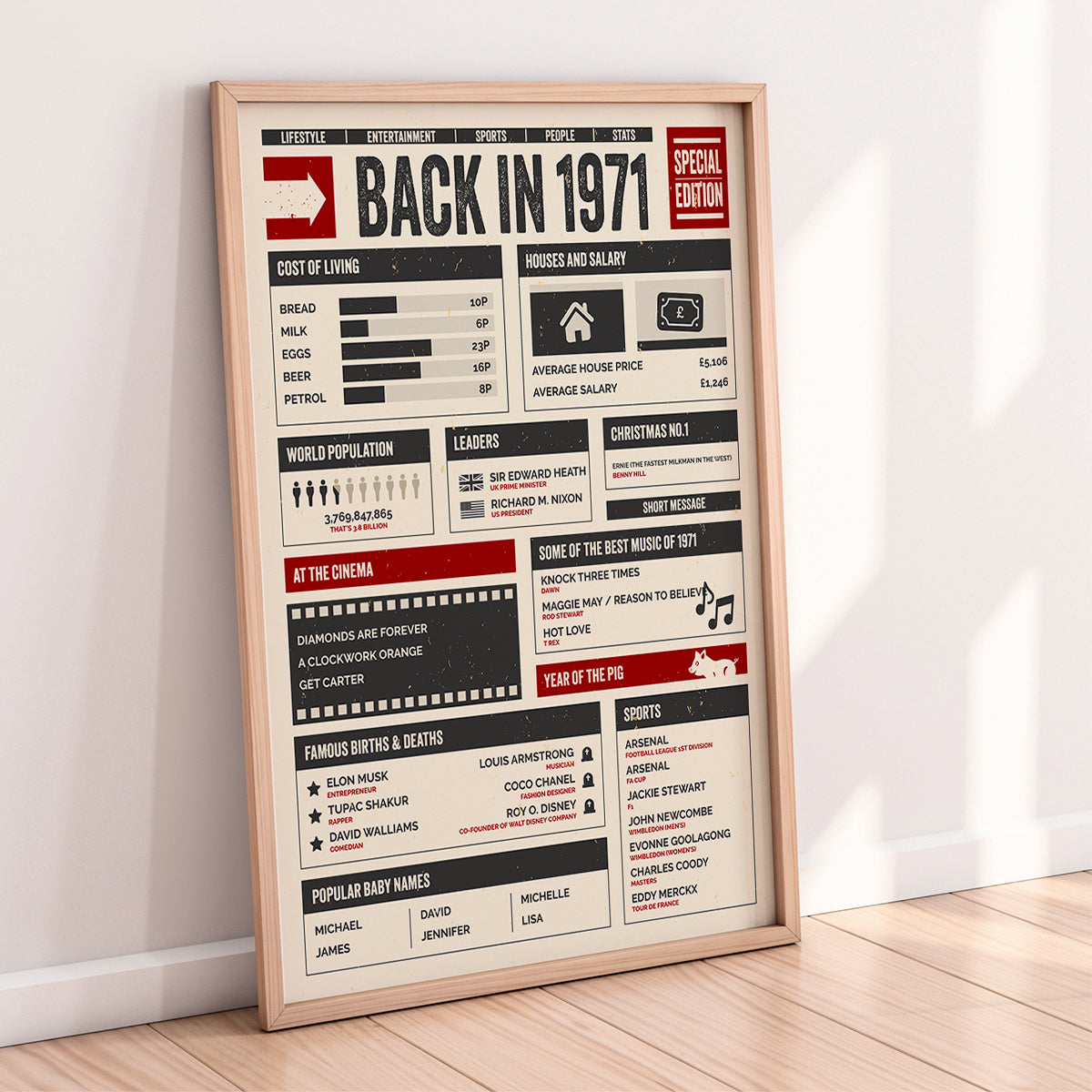 This vintage-inspired design stands out, inviting both men and women to reminisce about the year they were born, 1971. Decorate your home with this unique art print, which acts as a stunning centrepiece and conversation starter.