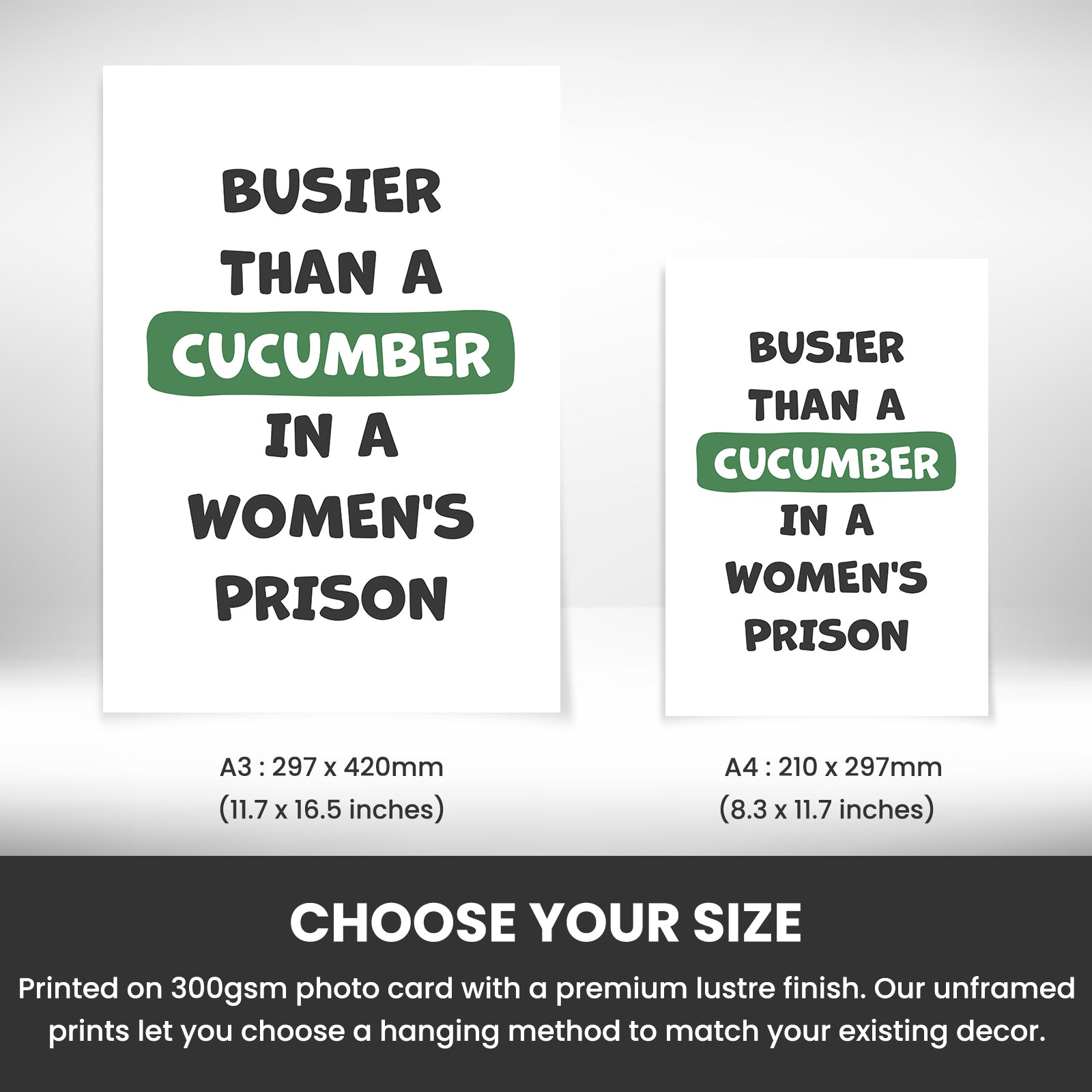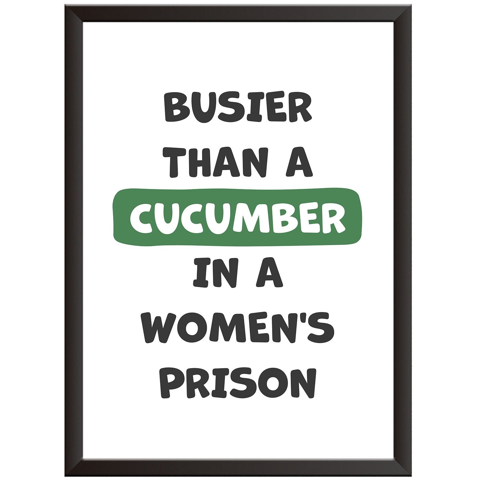 Transform your living space with our delightful "Busier than a Cucumber in a Women's Prison" wall art! This playful piece not only uplifts any room, but it also serves as a perfect conversation starter, bringing laughter and joy to your living room, kitchen, or bathroom.