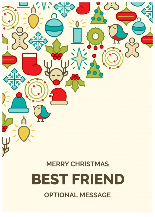 Bring a sense of festive cheer to their Christmas with our fun and cute Best Friend Christmas Card featuring joyful festive icons. This merry Christmas card, measuring a generous 7 x 5 inches, is professionally printed on 300gsm heavyweight card stock, presenting a tactile matte finish.