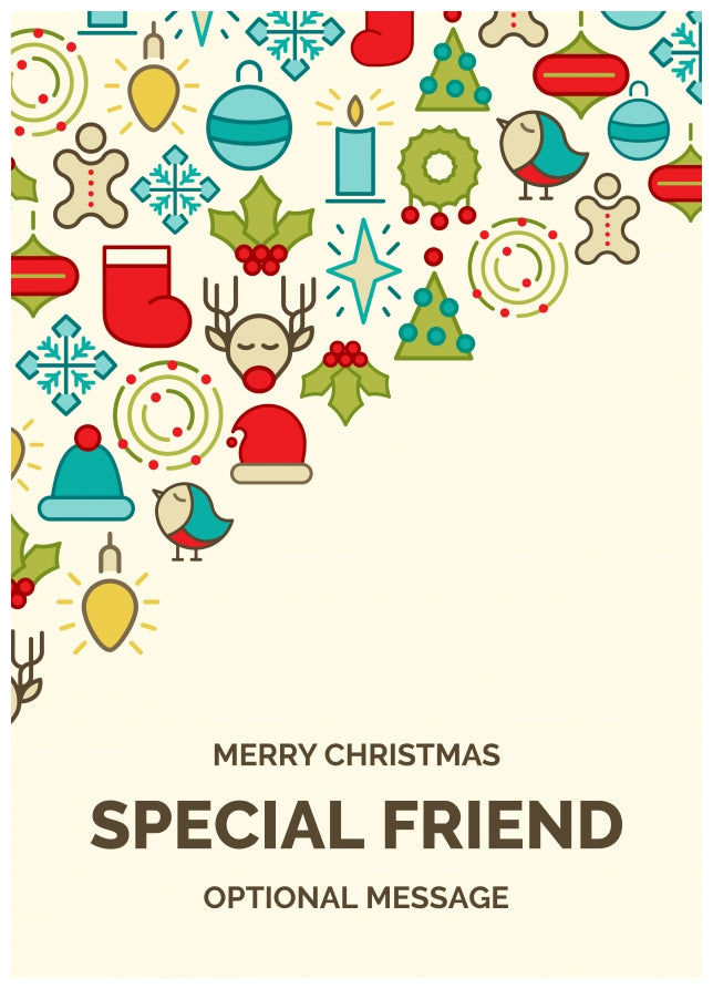 Bring a sense of festive cheer to their Christmas with our fun and cute Special Friend Christmas Card featuring joyful festive icons. This merry Christmas card, measuring a generous 7 x 5 inches, is professionally printed on 300gsm heavyweight card stock, presenting a tactile matte finish.