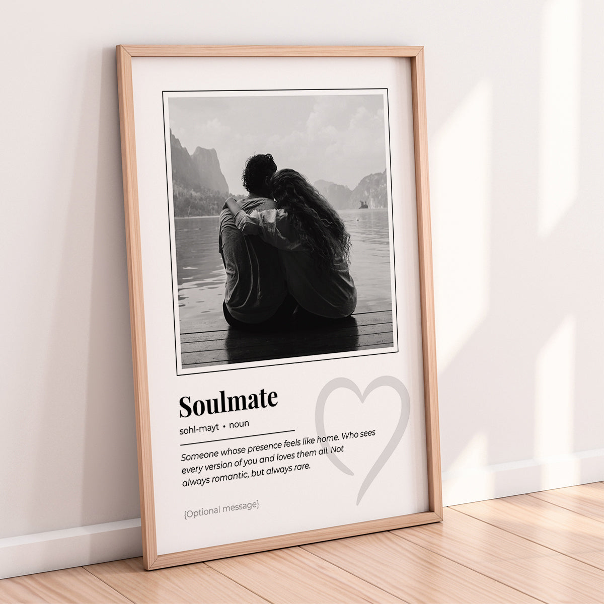 This soulmate definition print can be personalised with your own photo or kept text-only, with the option to add a short custom message beneath the definition.