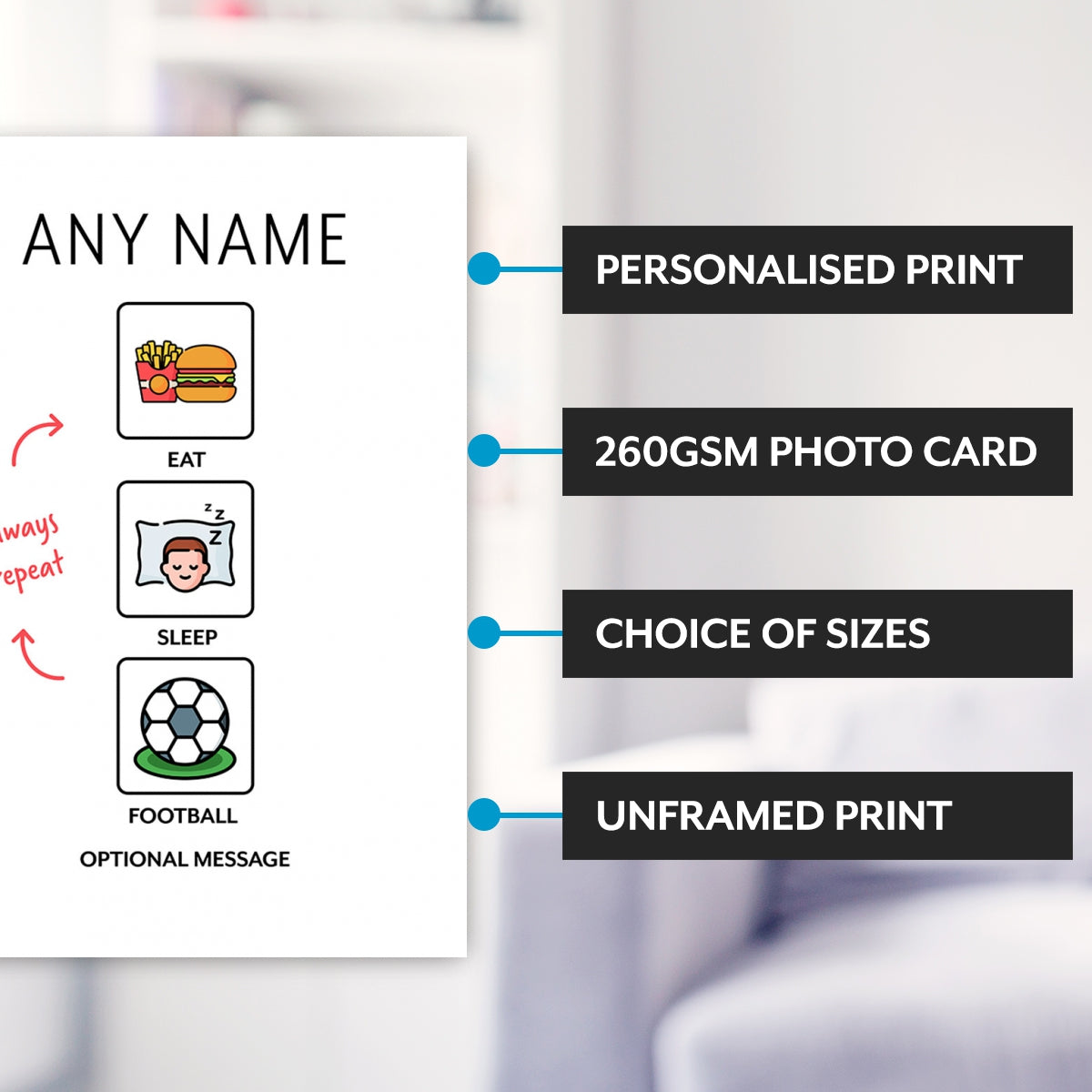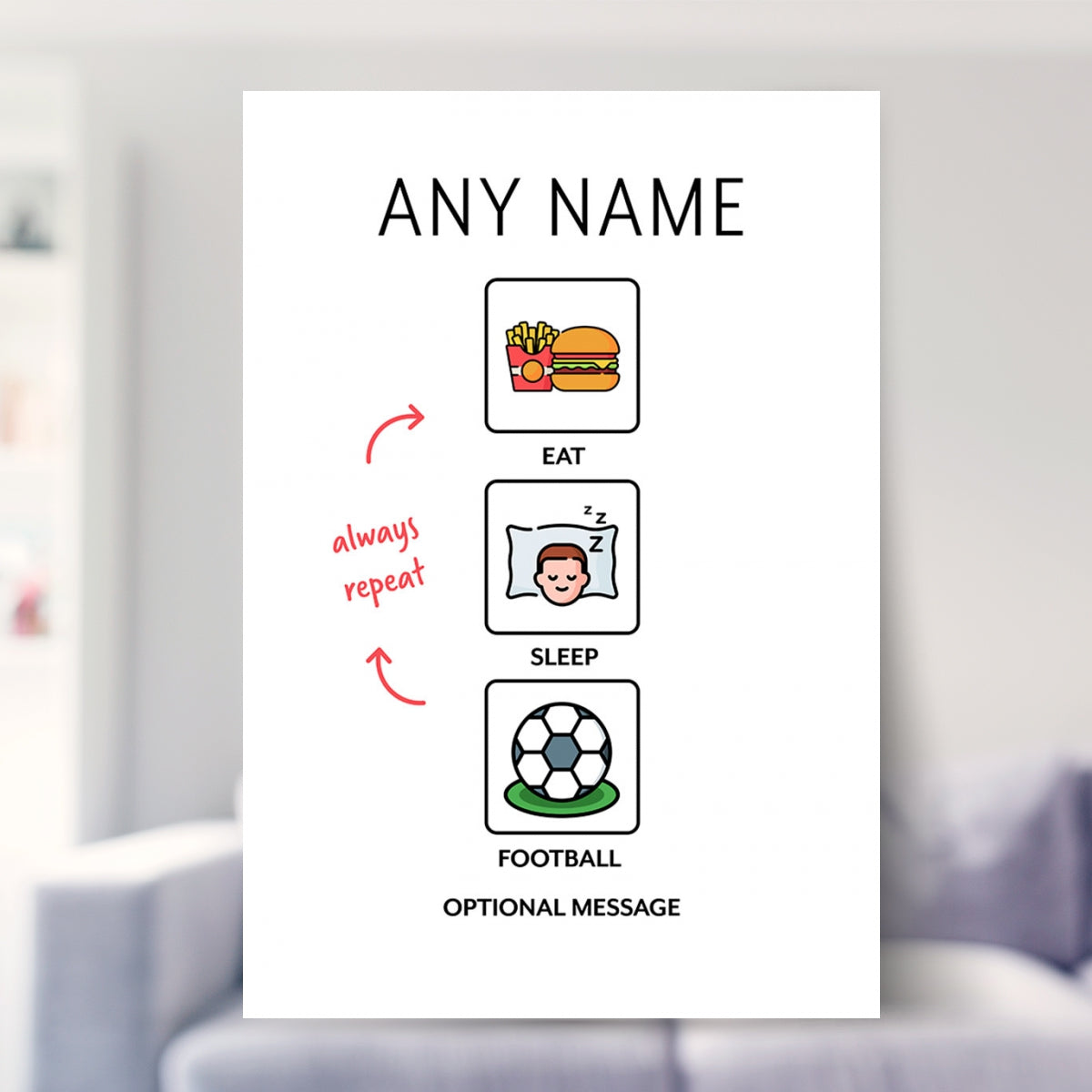 This fun football poster will look amazing hung in a boys bedroom, girls room or as a boys bedroom accessory. This can be given as a gift to your son / daughter / brother / sister or even to a football fan.