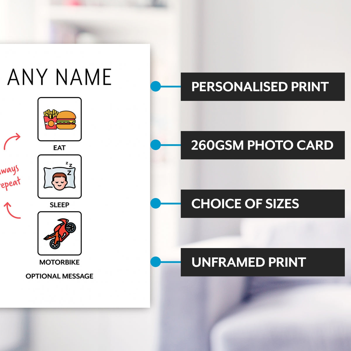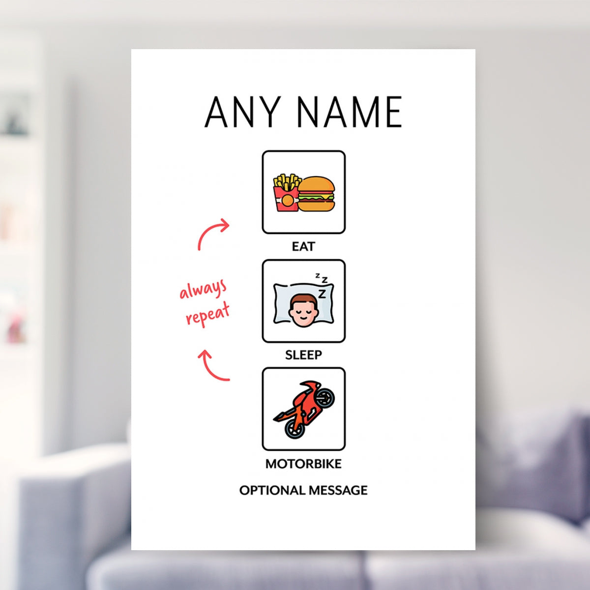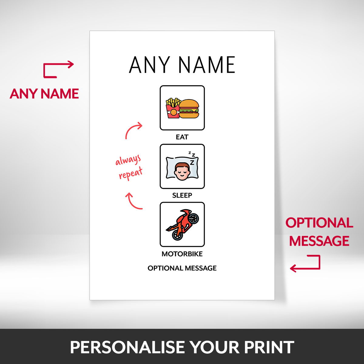 This fun motorbike poster will look amazing hung in a boys bedroom, girls room or as a boys bedroom accessory. This can be given as a gift to your son / daughter / brother / sister or even to a motorbike lover.