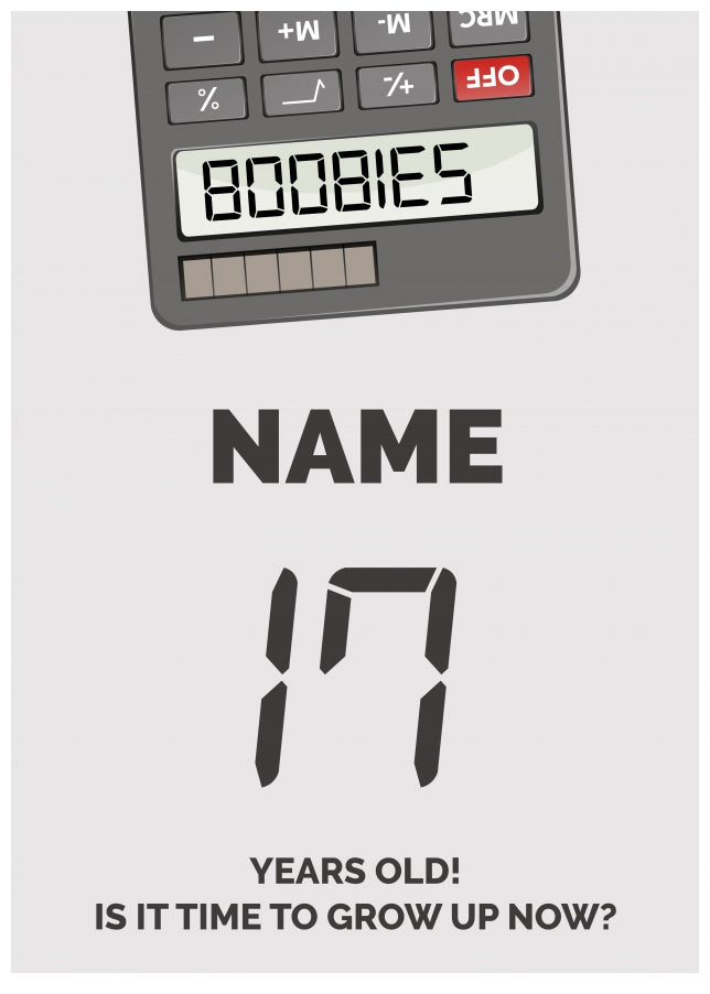 This fun 17th birthday card for an adult has been designed with an upside down calculator with the numbers 5318008 which spells out BOOBIES.