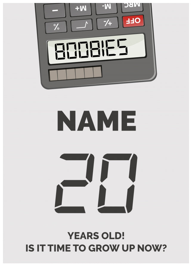 This fun 20th birthday card for an adult has been designed with an upside down calculator with the numbers 5318008 which spells out BOOBIES.