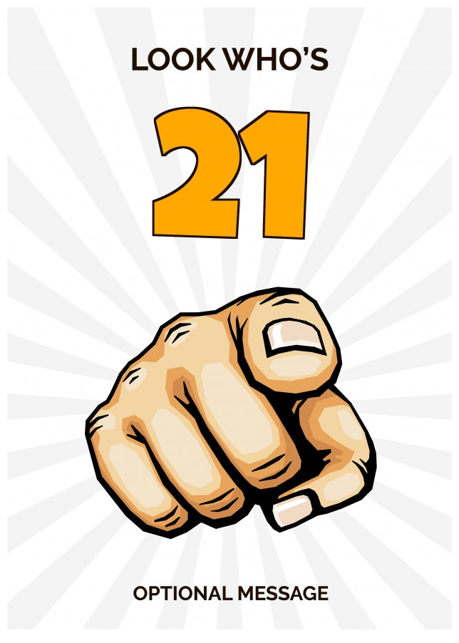 This fun 21st birthday card for an adult has been designed with a large finger pointing at the recipient.