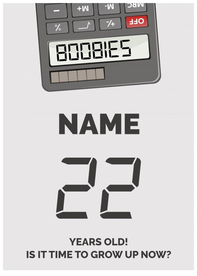 This fun 22nd birthday card for an adult has been designed with an upside down calculator with the numbers 5318008 which spells out BOOBIES.