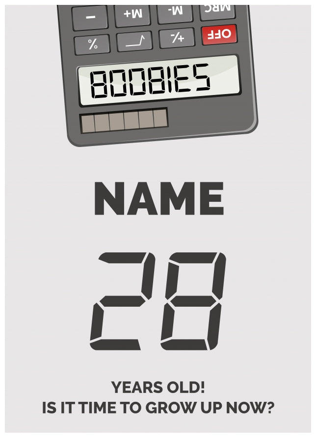 This fun 28th birthday card for an adult has been designed with an upside down calculator with the numbers 5318008 which spells out BOOBIES.