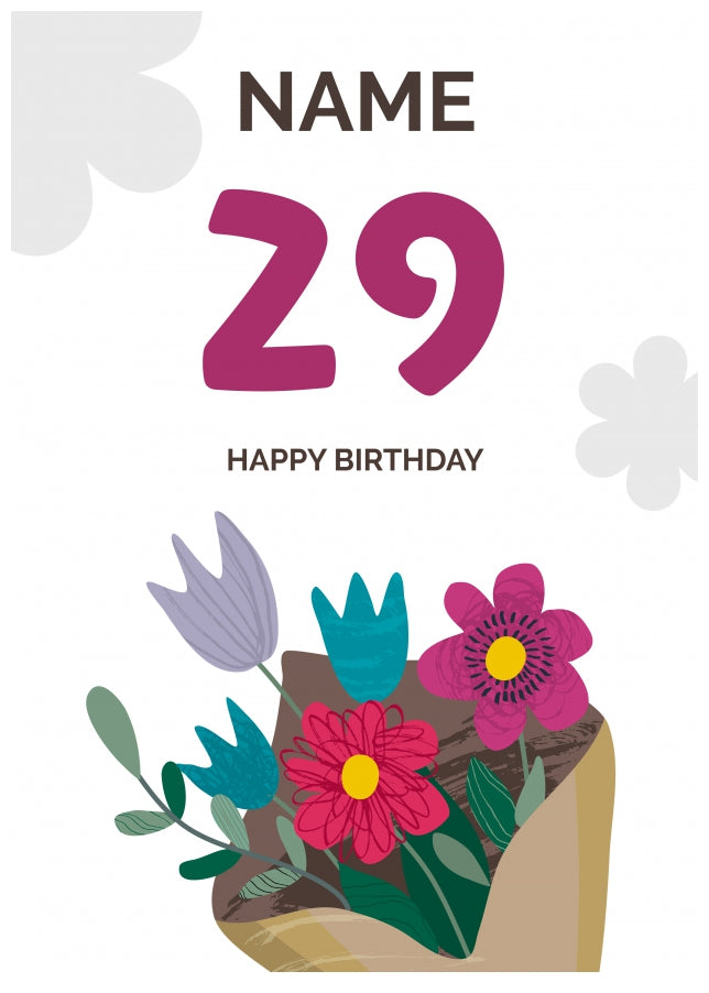 This fun 29th birthday card for her has been designed with a bunch of flowers on the front.