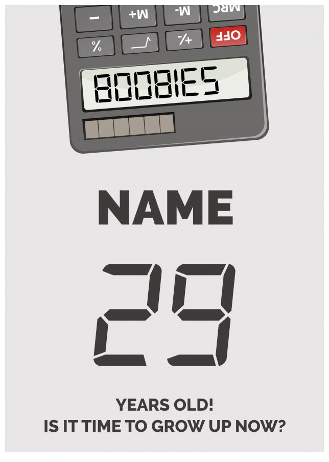This fun 29th birthday card for an adult has been designed with an upside down calculator with the numbers 5318008 which spells out BOOBIES.