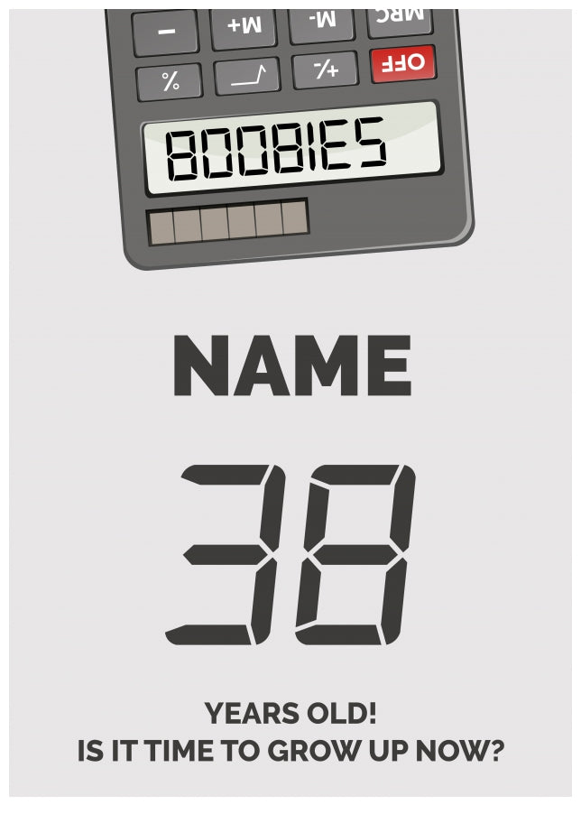 This fun 38th birthday card for an adult has been designed with an upside down calculator with the numbers 5318008 which spells out BOOBIES.
