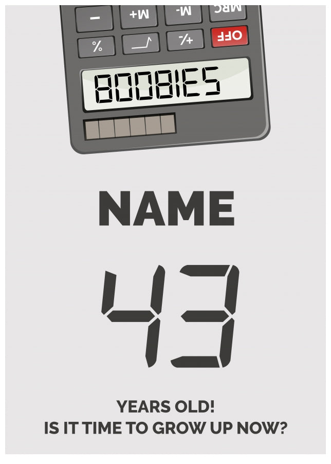 This fun 43rd birthday card for an adult has been designed with an upside down calculator with the numbers 5318008 which spells out BOOBIES.
