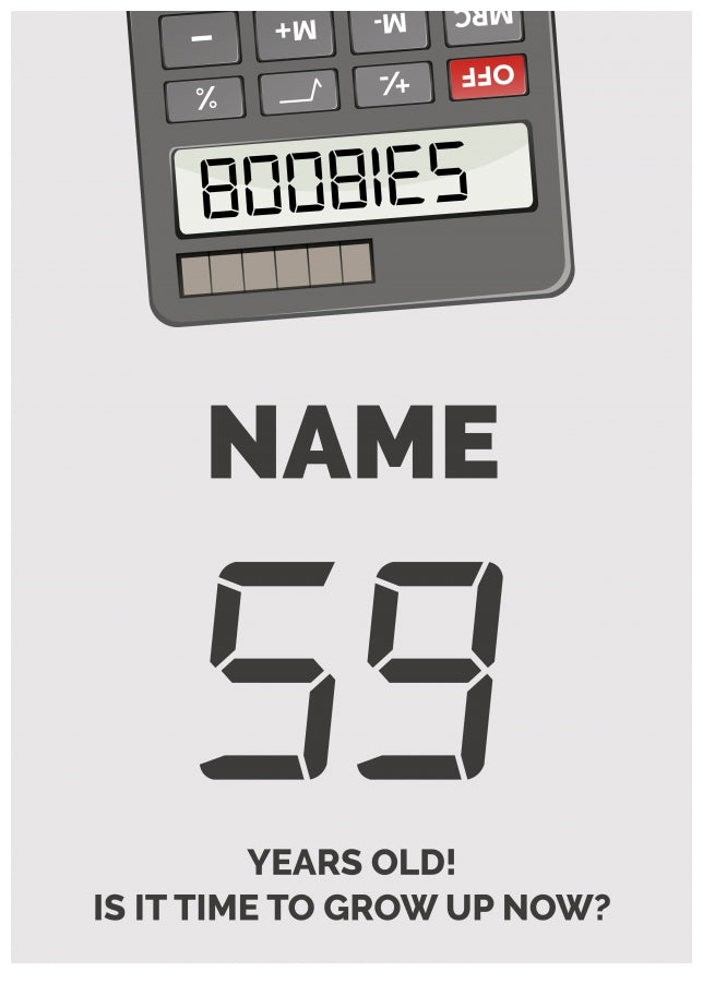 This fun 59th birthday card for an adult has been designed with an upside down calculator with the numbers 5318008 which spells out BOOBIES.