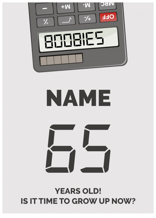 This fun 65th birthday card for an adult has been designed with an upside down calculator with the numbers 5318008 which spells out BOOBIES.
