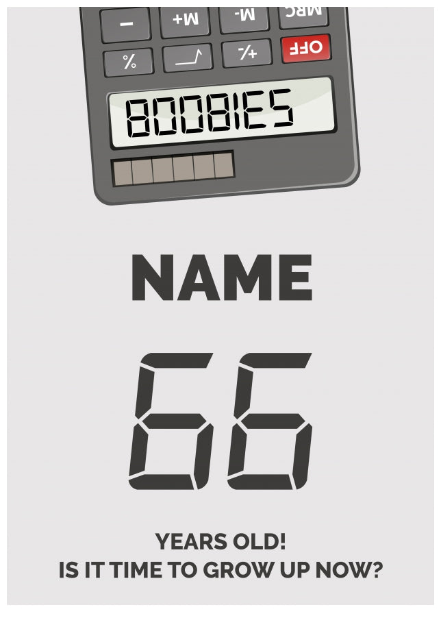 This fun 66th birthday card for an adult has been designed with an upside down calculator with the numbers 5318008 which spells out BOOBIES.