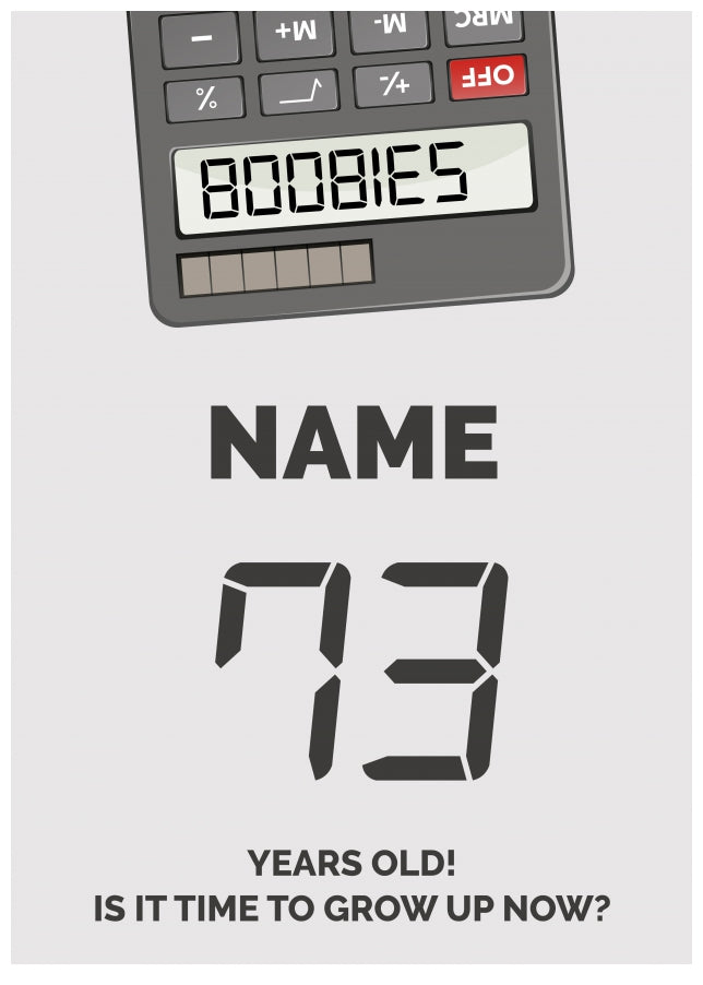 This fun 73rd birthday card for an adult has been designed with an upside down calculator with the numbers 5318008 which spells out BOOBIES.