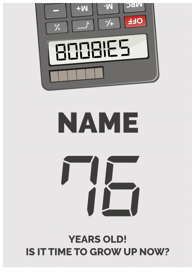 This fun 76th birthday card for an adult has been designed with an upside down calculator with the numbers 5318008 which spells out BOOBIES.