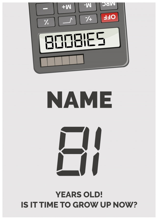 This fun 81st birthday card for an adult has been designed with an upside down calculator with the numbers 5318008 which spells out BOOBIES.