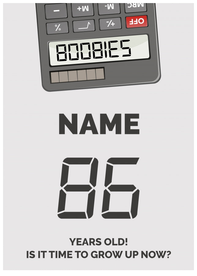 This fun 86th birthday card for an adult has been designed with an upside down calculator with the numbers 5318008 which spells out BOOBIES.