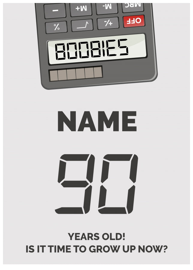 This fun 90th birthday card for an adult has been designed with an upside down calculator with the numbers 5318008 which spells out BOOBIES.