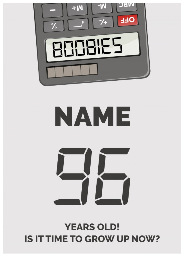 This fun 96th birthday card for an adult has been designed with an upside down calculator with the numbers 5318008 which spells out BOOBIES.