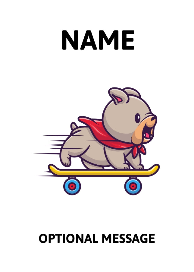 A fun and bold greetings card with a Bulldog on Skateboard on the front. It can be used for almost any occasion including kids birthday, father's day, Christmas and more.