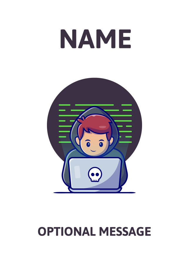 A fun and bold greetings card with Hacker on the front. It can be used for almost any occasion including kids birthday, father's day, Christmas and more.