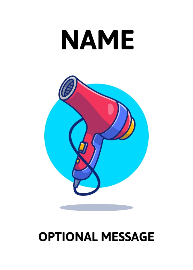 A fun and bold greetings card with a Hair Dryer on the front. It can be used for almost any occasion including kids birthday, Christmas and more.