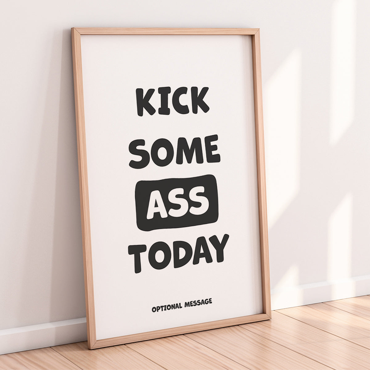 Bold and sweary motivational wall art for anyone who needs a little push to get things done. The simple black and white typography spells out “Kick some ass today” and creates a strong graphic statement on any wall.