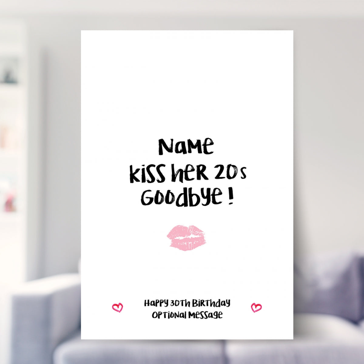 "(name) kiss her teens goodbye!" in the middle of the print with "Happy 30th Birthday" at the bottom. Can also be personalised with a short message below this too. This is so that all the ladies can put their own kisses and message on making it super personal.