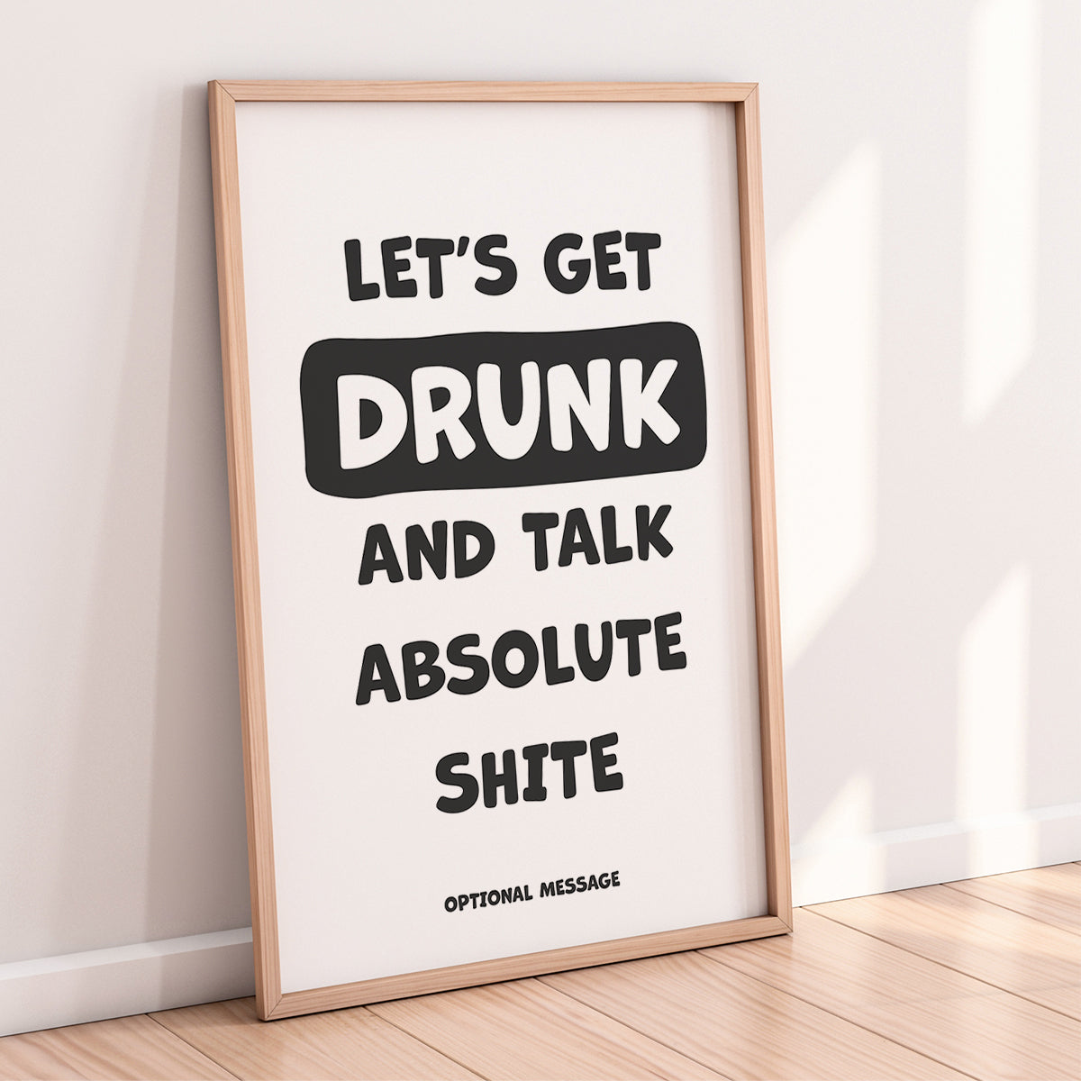 A hilarious print for anyone who loves a night of drinks, nonsense and questionable conversation. This modern bold-text design features the phrase let's get drunk and talk sh!te, making it the perfect addition to kitchens, living rooms, home bars or party spaces.