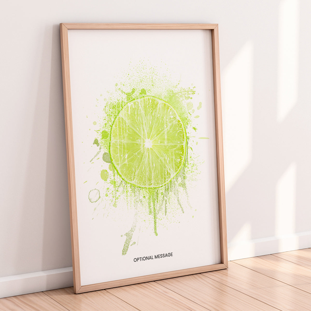 Bring a fresh, zesty feel to your kitchen with this green lime wall art, featuring a bold watercolour splatter fruit illustration.