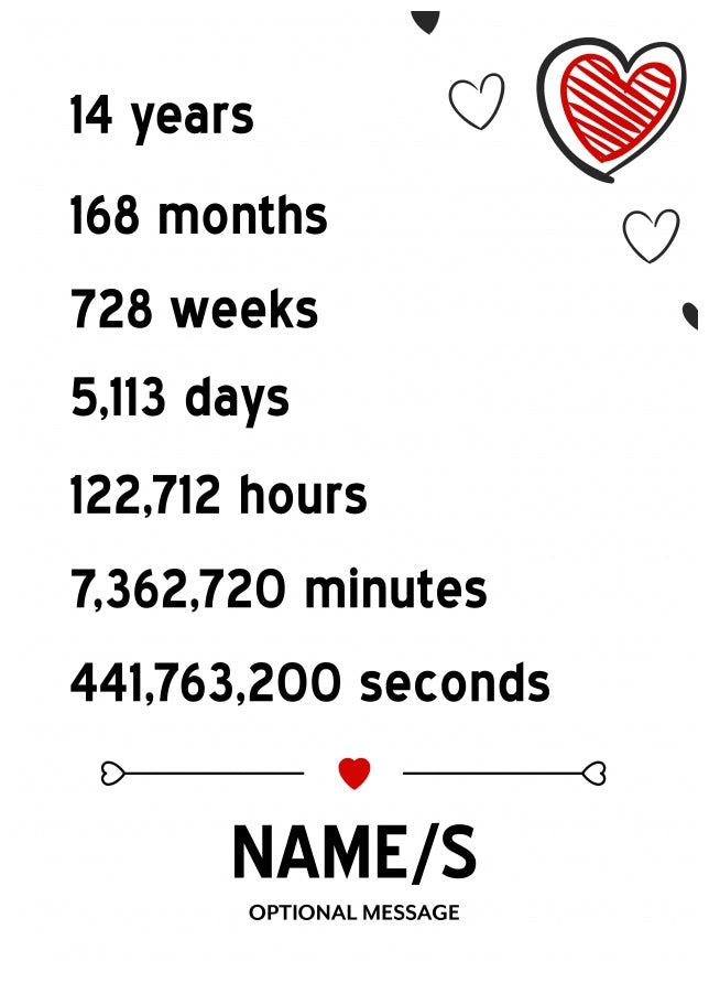 This 14th anniversary Card has been designed with black and red hearts with the following text.