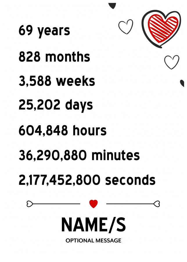 This 69th anniversary Card has been designed with black and red hearts with the following text.