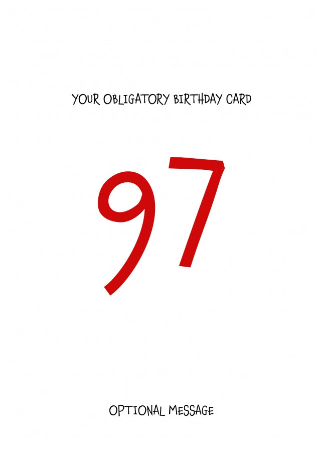 A humorous birthday card for men, women, friend, dad, mum, husband, wife, brother, sister, nana, grandad or any recipient. A simple card to say happy 97th birthday to you!