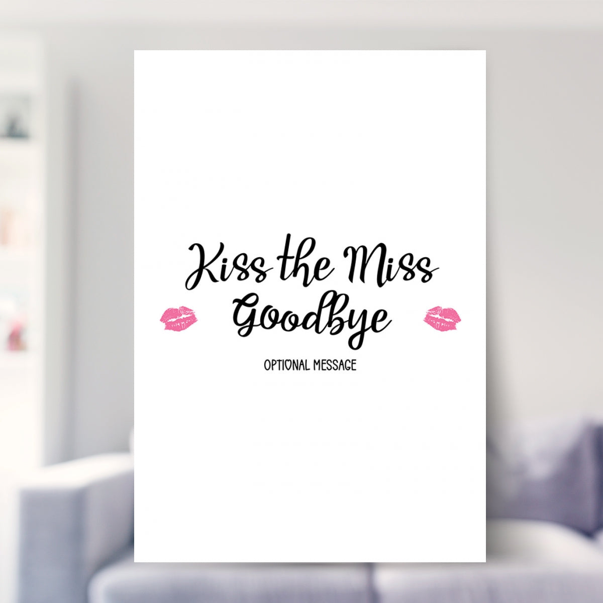 The print has the words "Kiss the Miss Goodbye" (with small printed kisses either side) followed by a message of your choice which can include name, hen party date, location etc.