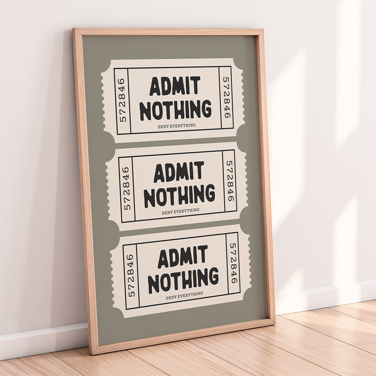 This retro inspired wall art print recreates a vintage ticket stub with the bold, tongue in cheek phrase “Admit Nothing” and the smaller caption “Deny Everything”. The neutral colour palette keeps the look clean and modern while still nodding to classic cinema and circus ticket designs.