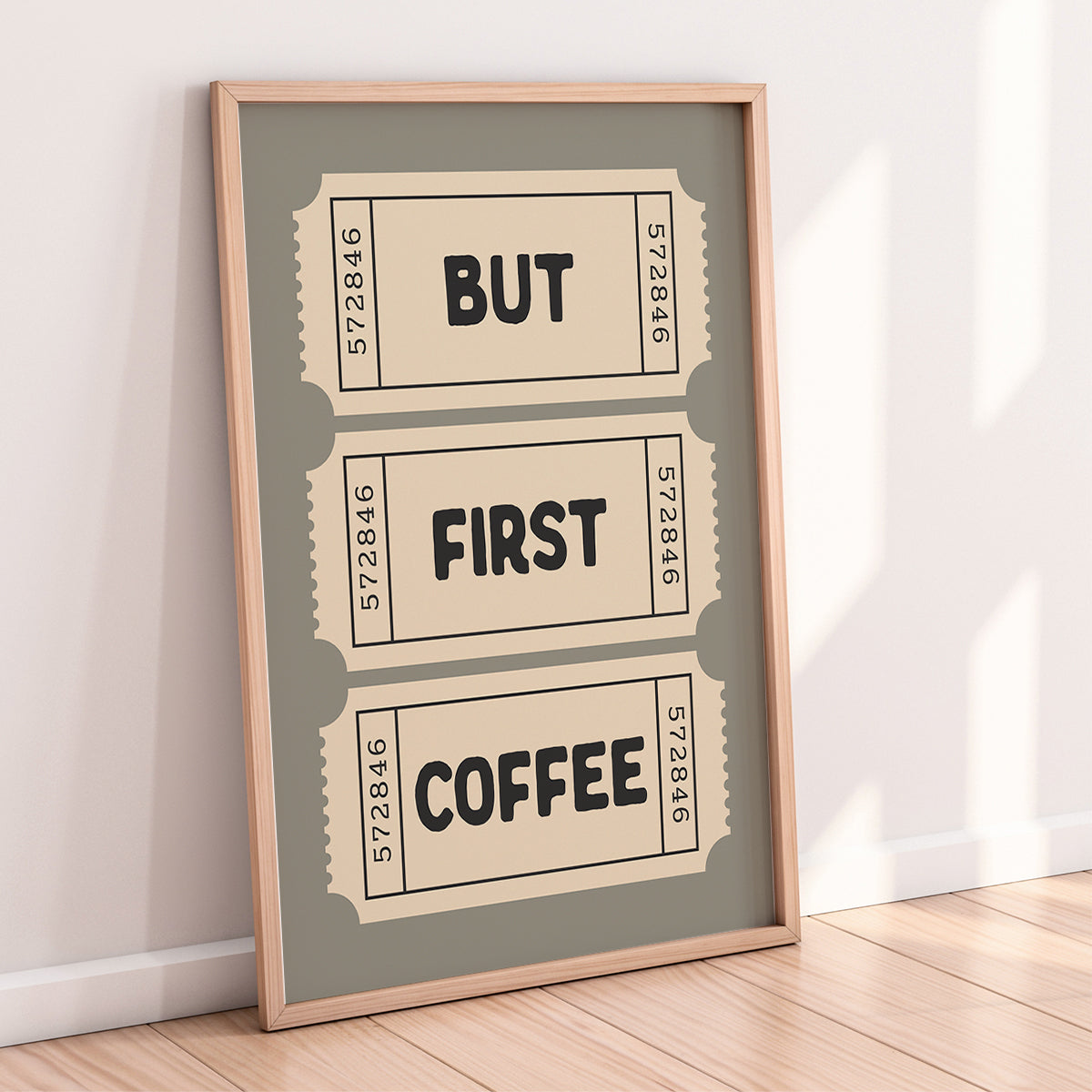 A vintage inspired ticket stub style wall art print featuring the phrase “But first coffee”, perfect for caffeine lovers and morning slow starters. The playful retro layout combined with bold typography gives it a nostalgic charm, making it ideal for kitchens, coffee corners, offices or living rooms.