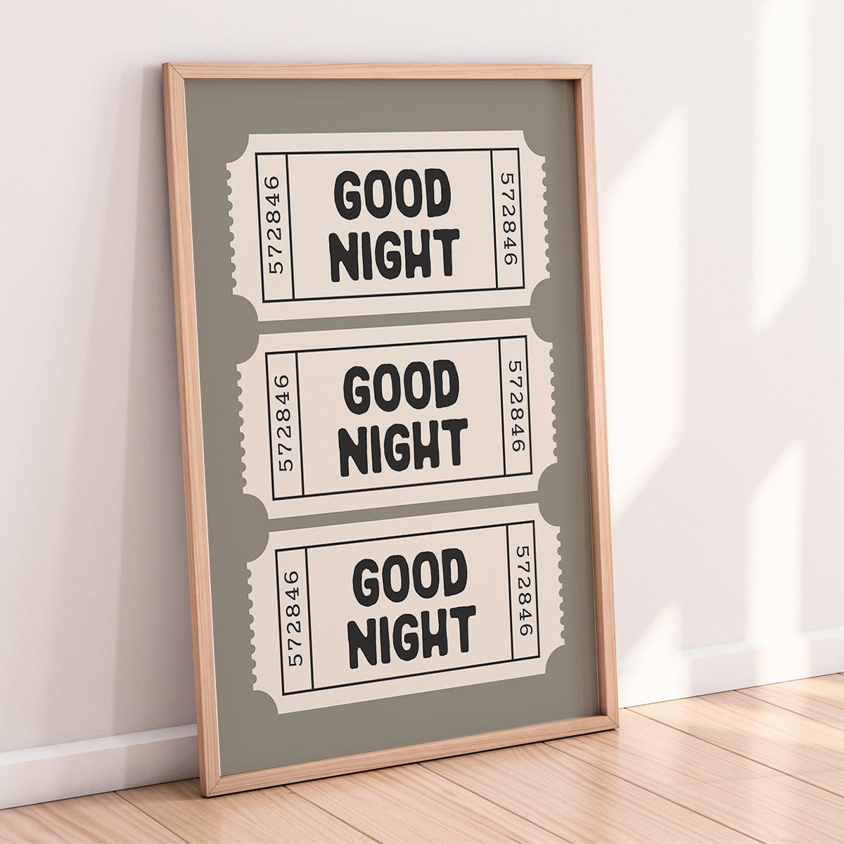 A charming retro style ticket stub wall art print featuring the phrase “Good Night”. Its nostalgic ticket-inspired layout and bold hand drawn lettering make it a calming yet quirky addition to any bedroom, guest room or cosy living space.